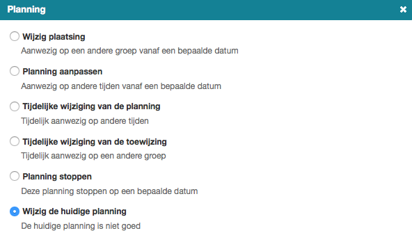 Wanneer er een vaste planning aanwezig is klik je op het potloodje en verschijnt er een keuzemenu. Kies voor 'Wijzig de huidige planning' en klik op 'Volgende'.