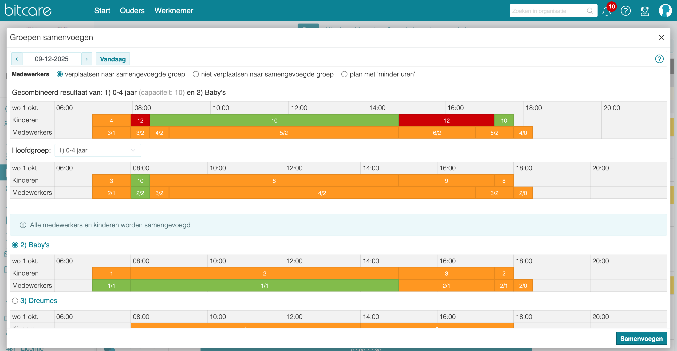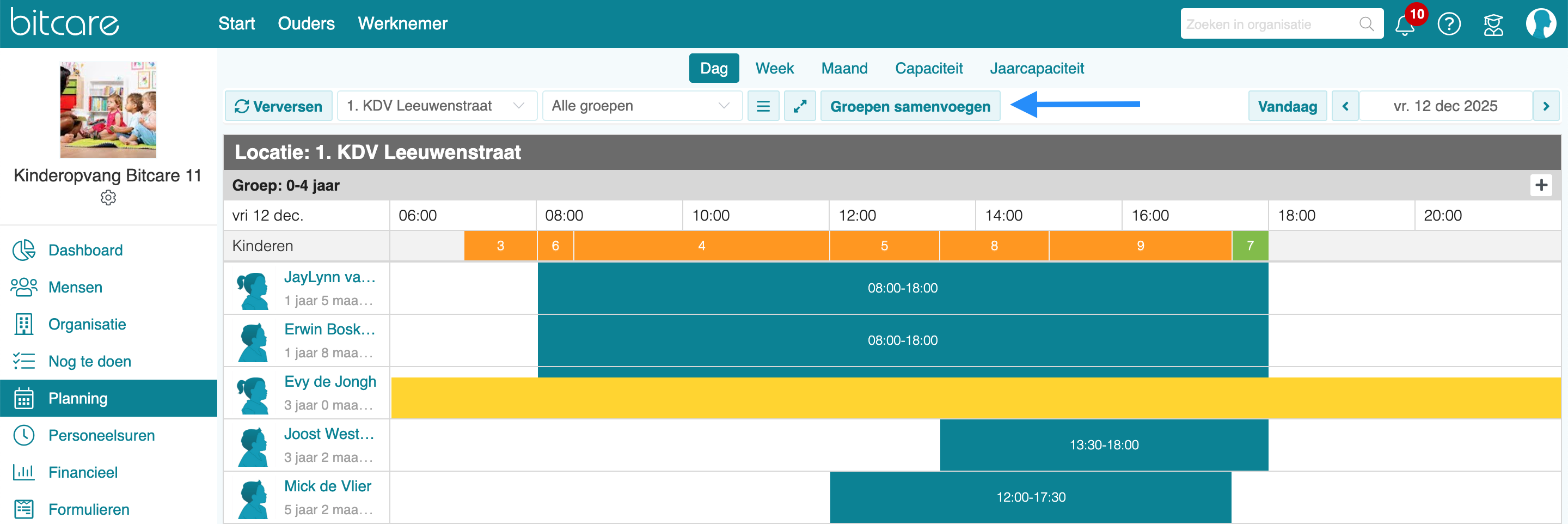 In Bitcare kun je groepen in de planning samenvoegen wanneer kinderen tijdelijk in één gezamenlijke groep worden geplaatst.