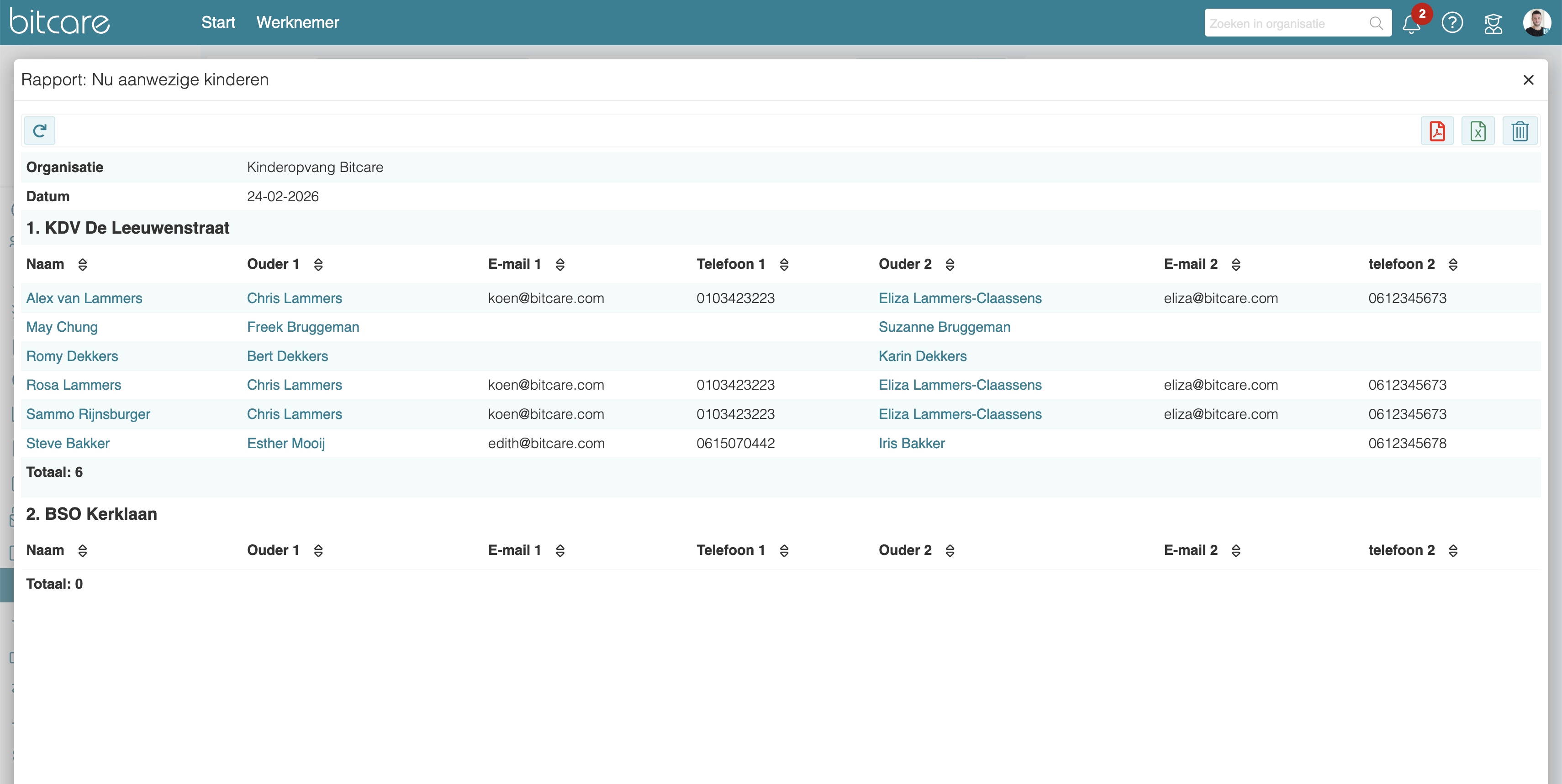 Wanneer je snel moet evacueren, is een noodlijst ideaal om direct te zien welke kinderen er op dat moment aanwezig zijn. Bitcare biedt een noodlijst aan waarop ook direct de contactgegevens van de ouder(s) staan. Deze lijst vind je op onderstaande wijze.