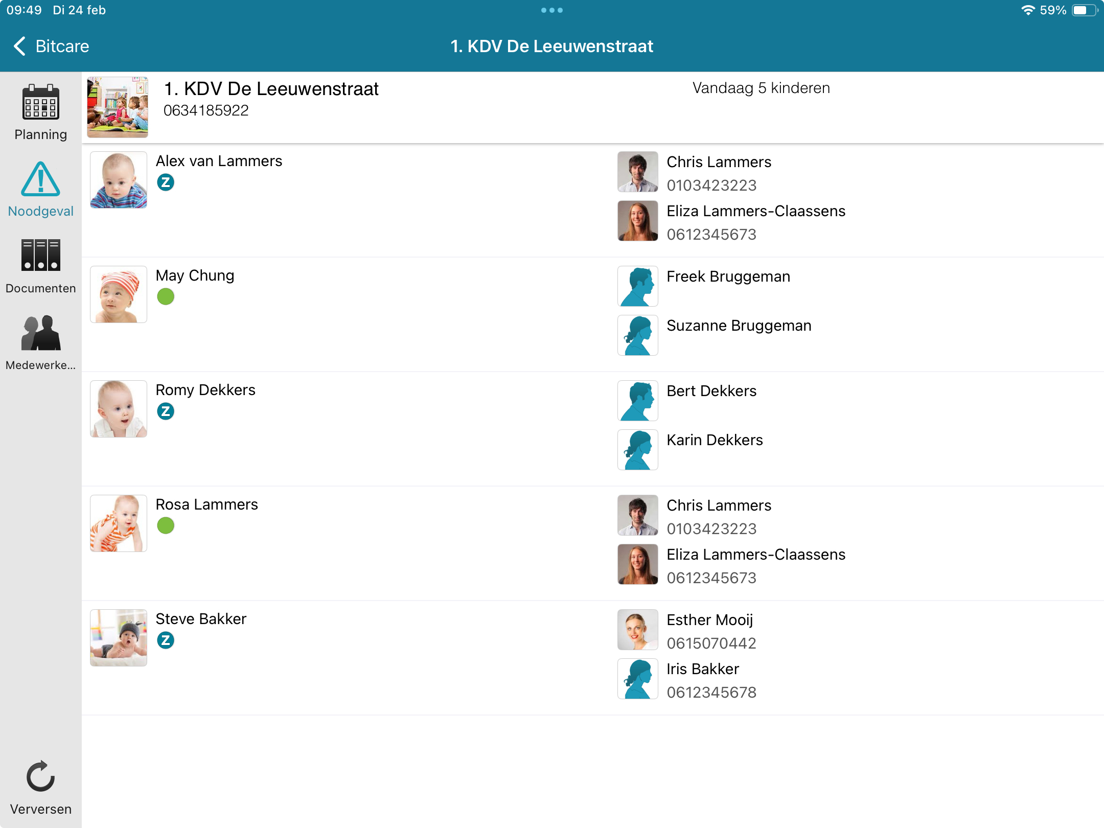 Je ziet direct het aantal ingeklokte kinderen rechtsboven, wie er lig te slapen en de telefoonnummers van de ouders.